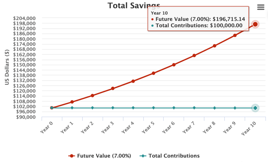 Consider this: an investment in the S&P 500 will, on average, give you an annual return of 7%. That means any money you put in the S&P 500 will double every 10 years.